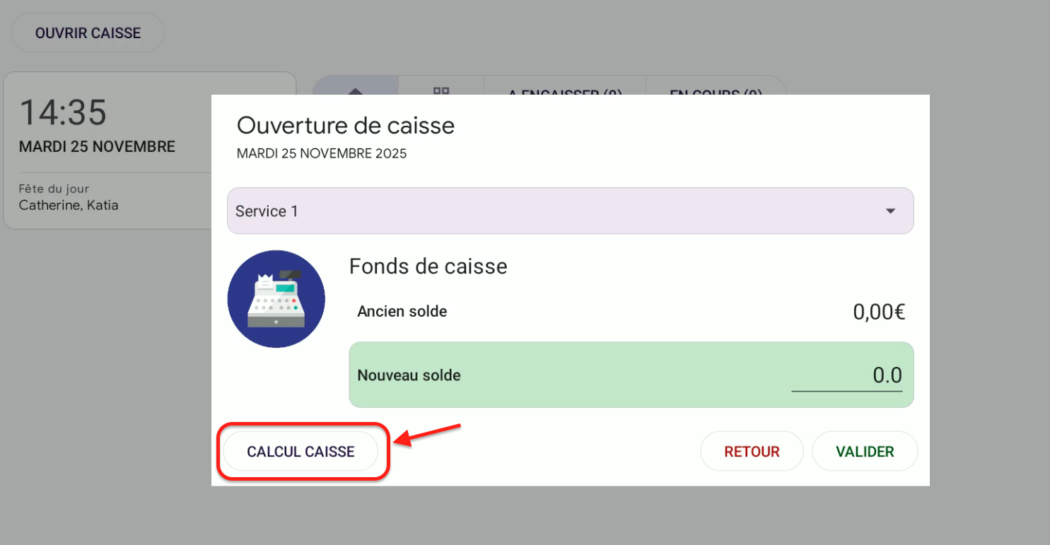 Ce montant est enregistré et verrouillé. Il servira à comparer les liquidités à la clôture. Il est également possible dès l’ouverture de compléter un comptage des valeurs en espèces en sélectionnant le bouton CALCUL CAISSE :