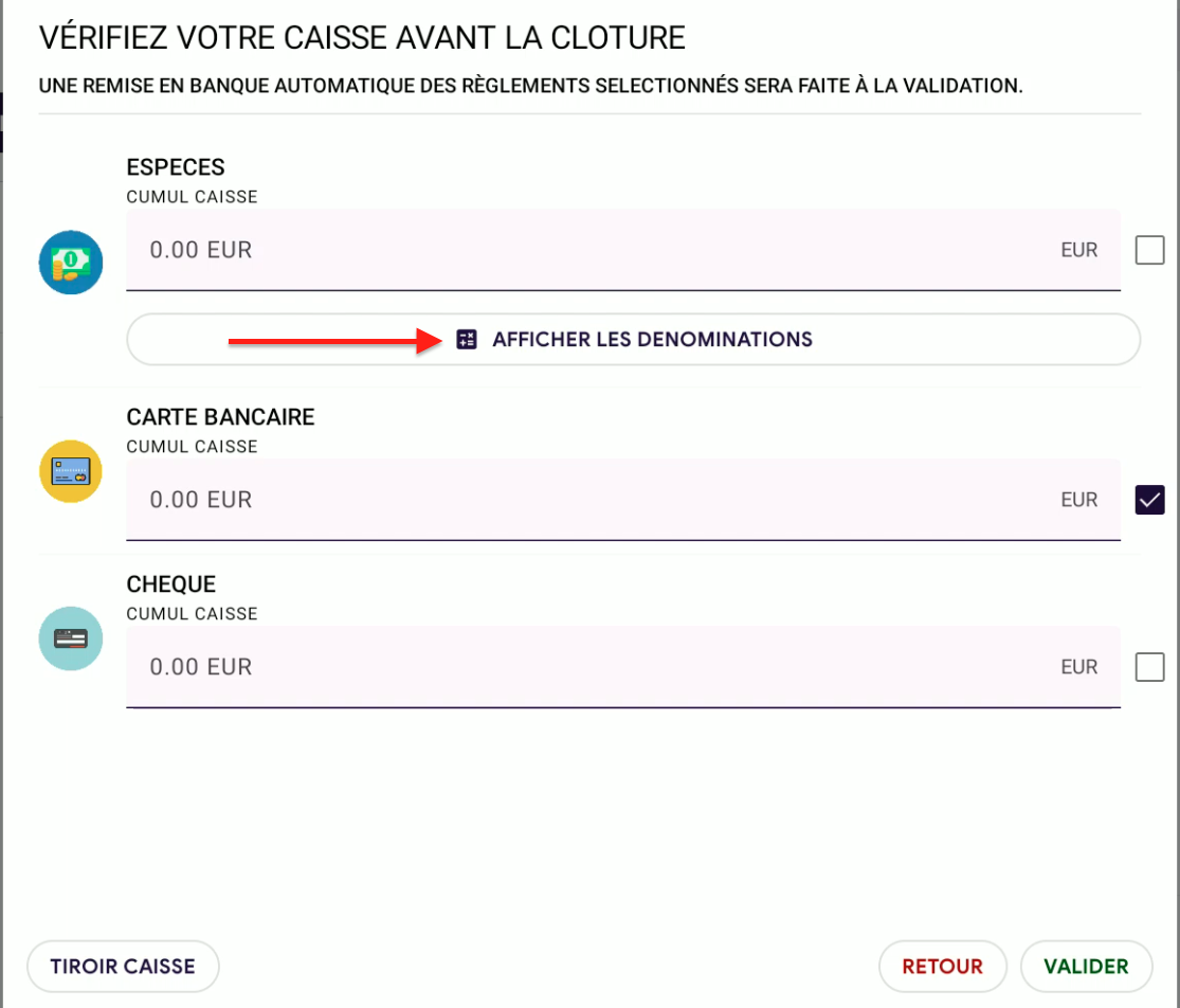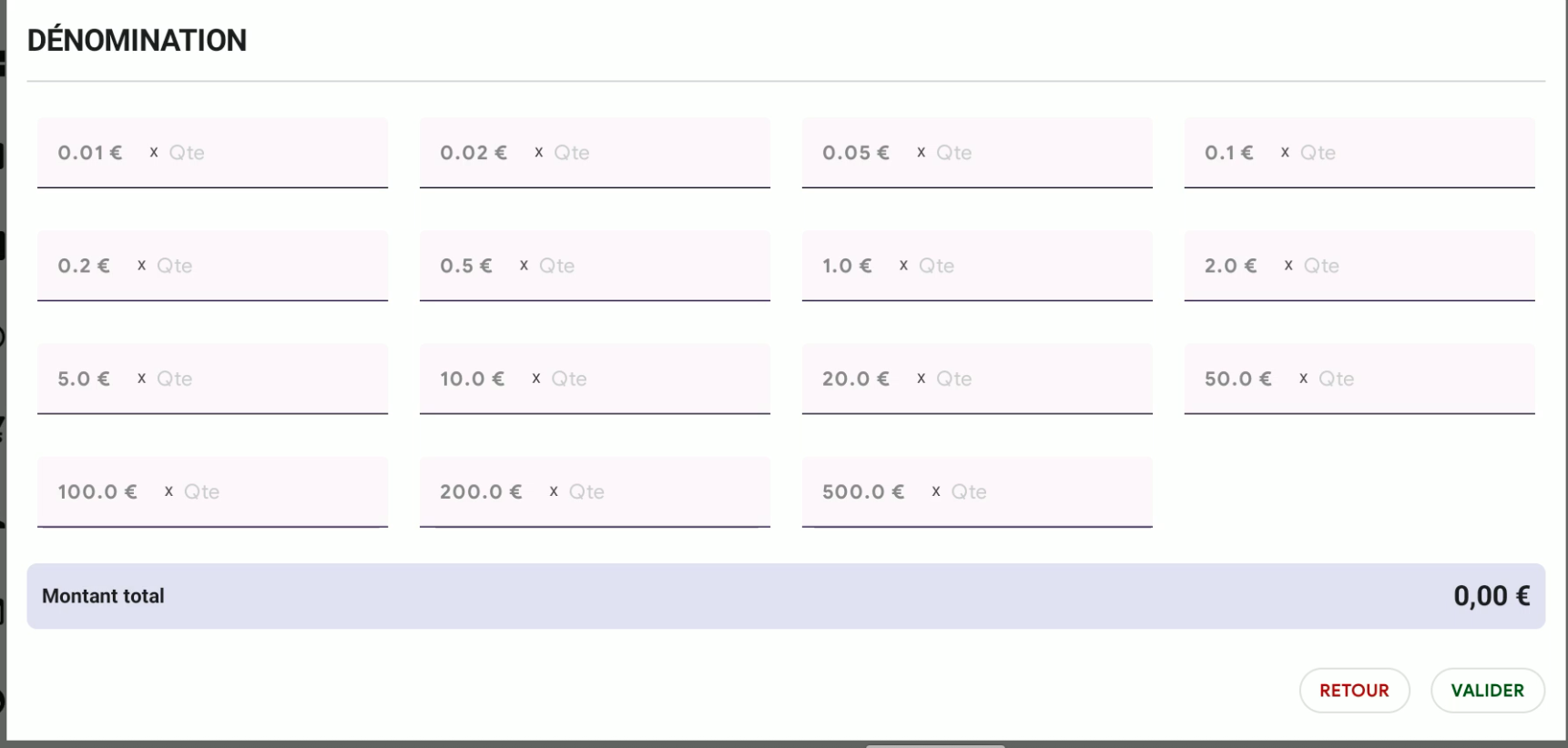 À la fin du service, le caissier saisit le montant qu’il a réellement dans son tiroir, pour chaque mode de paiement :