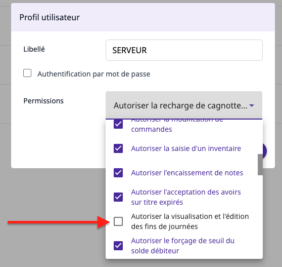 1 – Commencez par créer plusieurs profils utilisateur distincts de celui de l’administrateur, puis désactivez la permission suivante : « Autoriser la visualisation et l’édition des fins de journée ».